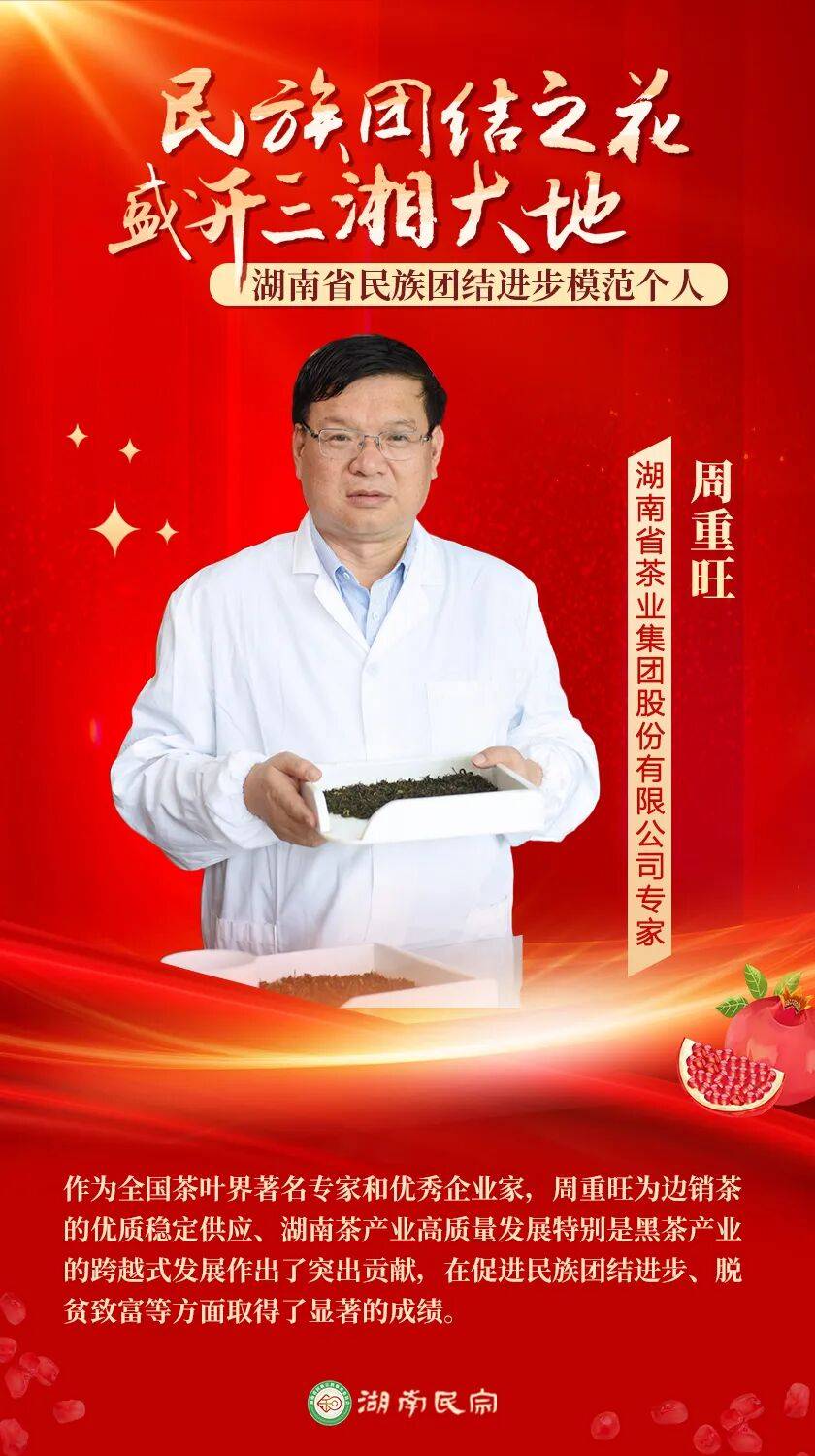 名片:周崇旺,毕业于湖南农业大学茶学系。 1986年7月参加工作,高级农艺师、高级茶叶鉴定师、国务院政府特殊津贴专家。如今,他是湖南茶业集团有限公司的专家,同时兼任中国茶叶流通协会副会长、全国边销茶叶专业委员会主任委员、湖南省行业协会会长、湖南省工业行业联合会会长。 2025年9月,中共湖南省委、湖南省人民政府授予周崇旺“湖南省民族团结发展模范个人”称号。湖南黑茶产销量占全国茶叶市场销量的50%以上,居全国第一。它发挥着积极作用确保西北各族人民边销茶叶稳定供应。目前,湖南国家指定储备茶叶90%以上的边销活动是由益阳茶厂和安化白沙溪茶厂进行的。香邑茯茶、白沙溪红茶品质优良,价格稳定,深受西北各族人民的认可。他们被称为“生命茶、幸福茶、团结茶”,为促进国家团结稳定做出了重大贡献。 “团结茶”和“健康茶” 作为全国茶叶边销专业委员会主任委员、全国茶叶标准化技术委员会黑茶工作组副组长,周崇旺主导并参与多项行业标准制定,争取多项国家政策,确保各族群众喝上“团结茶”。扩大福文字